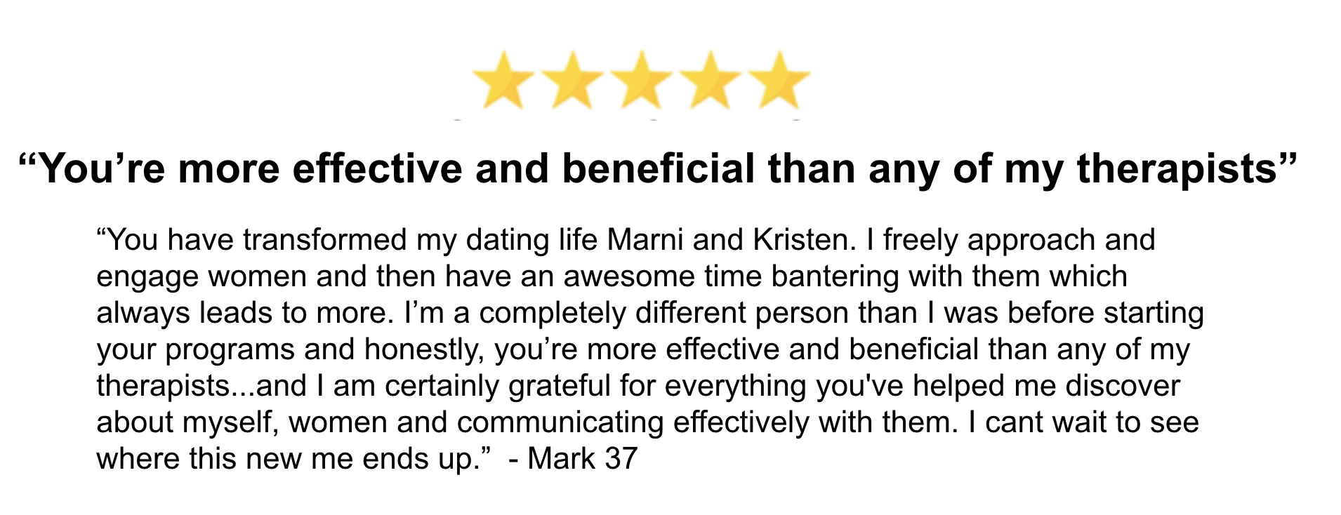 "Marni, I have been using some of your materials along with my own experiences and I must say, you have enriched my life and helped me sharpen my flirting skills." - Rudy ⭐️⭐️⭐️⭐️⭐️ 5/5