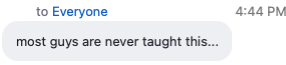 "These are the things I learned from Terah about connecting with women. 1. Simply listening. Listening to a woman's perspective and her experiences because in a lot of the time it will be different then what you think her perspective maybe 2. To ask questions to have complete understanding of her experience and feelings. 3. You don't have to agree. Men and women are just different and will not agree on 100% of things and it is okay. You have to respect each other that you don't agree and move on."